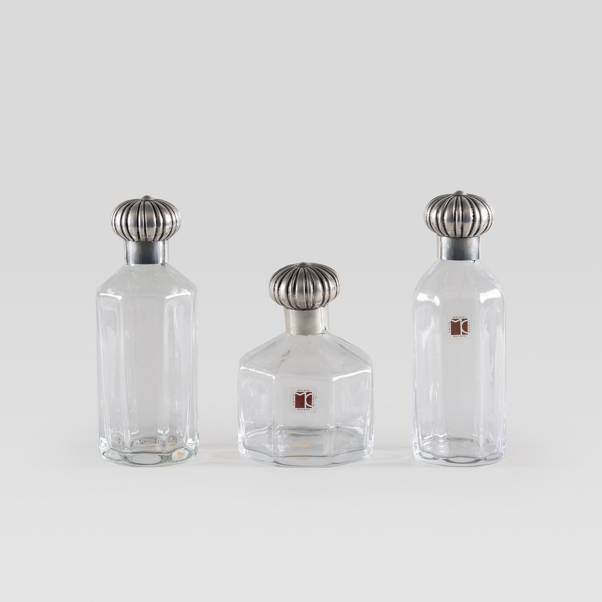 Murano, anni 80-90 set di tre bottiglie in vetro trasparente con tappi in argento, etichetta della produzione