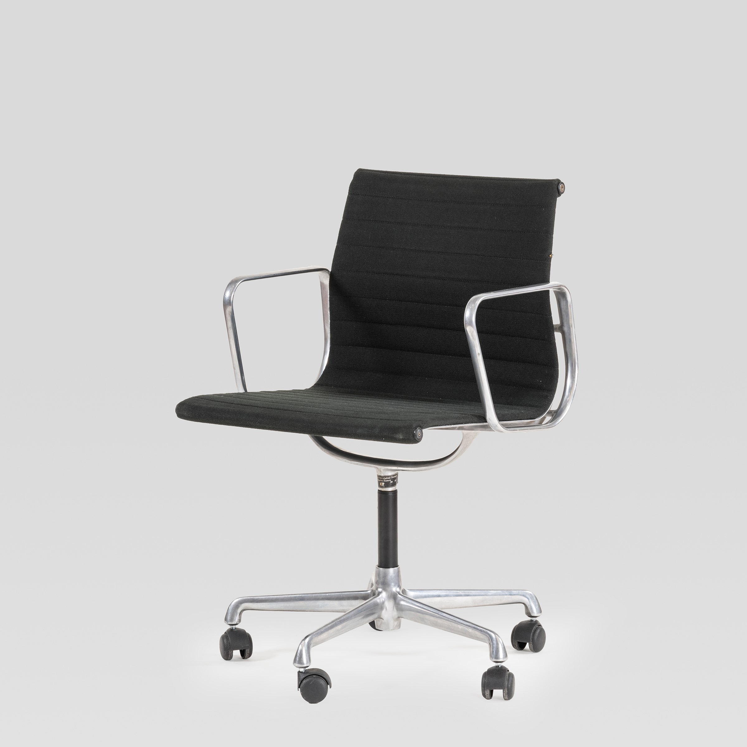 Italia, anni 60-70 sedia da uffucio mod. Aluminium, in alluminio e tessuto nero, etichetta della produzione