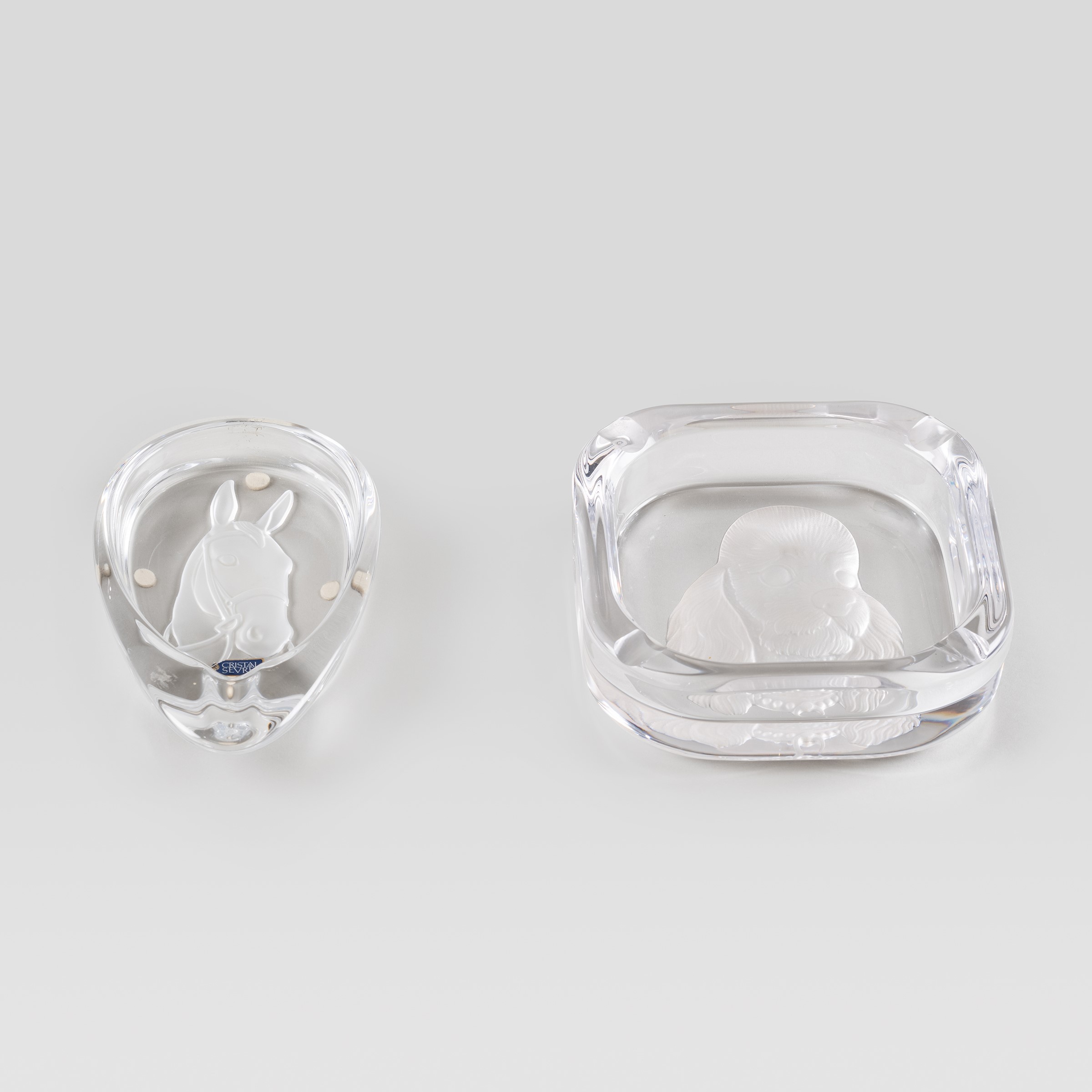 Francia, anni 80 due posacenere in cristallo con animali, marchio della produzione
