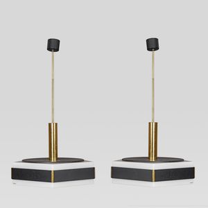 78x45x45 cm. Italia, anni 60 coppia di lampade a sospensione in ottone, metallo verniciato e perspex, marchio [..]