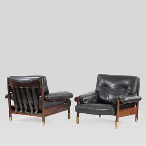 80x100x90 cm. Italia, anni 60 coppia di poltrone mod. Sella in legno, ottone e pelle imbottita Bibliografia: [..]