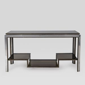 79x140x42 cm. anni 70 console in acciaio, ottone e vetro fumè