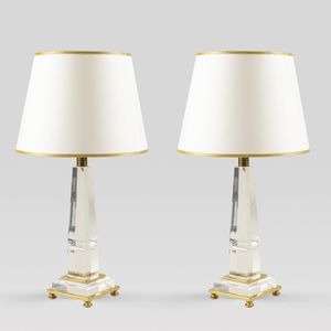 h. 66 cm. Francia, anni 70 coppia di lampade da tavolo in metacrilato ed ottone a forma di obelisco, complete [..]