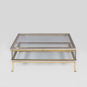 41x109x109 cm. anni 70 tavolino basso in acciaio cromato, ottone e vetro trasparente