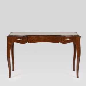 78x129x59 cm. anni 30 scrivania in legno, vetro dorato, ottone
