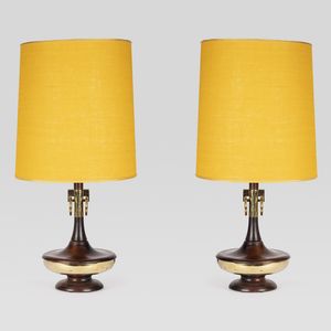 77x32 cm. anni 50 coppia di lampade da tavolo in legno ed ottone, complete di paralumi in juta