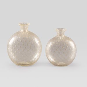h. 17-15 cm. Murano, anni 50-60 coppia di vasi in vetro soffiato a bolle con inclusioni dorate, firma a punta