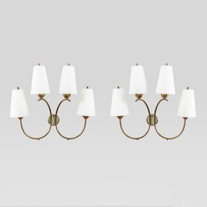 45x50x16 cm. Italia, anni 50-60 coppia di lampade da parete in ottone e vetro satinato, marchi della produzio [..]