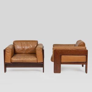 66x80x90 cm. Italia, anni 60-70 coppia di poltrone mod. Bastiano in legno e pelle imbottita, marchio della produzione [..]