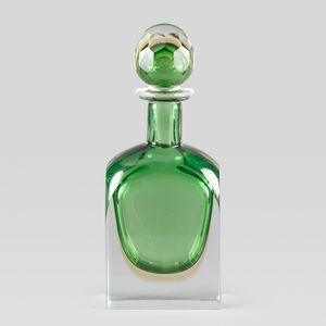 37x15x8 cm. anni 70 grande bottiglia in vetro sommerso, etichetta della produzione, lievi usure