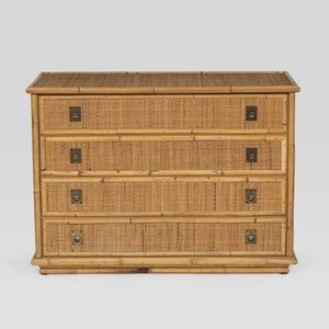 76x106x47 cm. Italia, anni 70 cassettiera in vimini, bambù e ottone