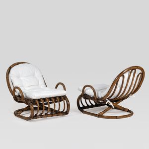 poltrone 84x65x60 cm. - tavolino 56x60 cm. anni 60 set da giardino in rattan e bambù, composto da una coppia [..]