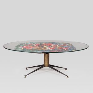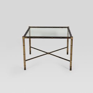 48x76x76 cm. anni 50 tavolino basso in metallo verniciato, ottone e vetro trasparente