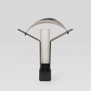 40x36x17 cm. Italia, anni 80 lampada da tavolo mod. Palio in metallo lacccato, alluminio e vetro opalino, marchio [..]