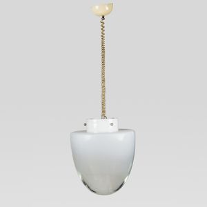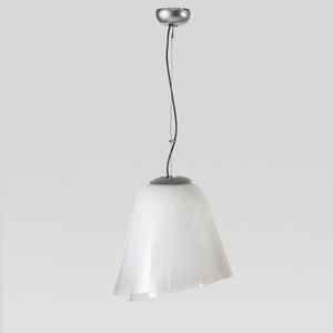 94x34 cm. Italia, anni 70-80 lampada a sospensione mod. Giglio in vetro bianco sfumato e trasparente, metallo [..]