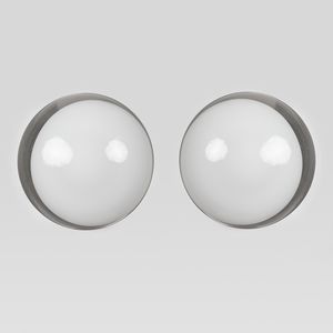 d. 32 cm. italia, anni 60 coppia di lampade da parete mod. Gill, in metallo cromato, vetro soffiato trasparente [..]