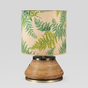 74x49 cm. anni 50-60 lampada da tavolo in midollino e ottone, completa di paralume in tessuto