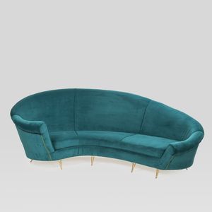 95x250x137 cm. anni 50 divano curvo in tessuto imbottito e ottone