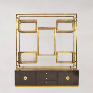 220x180x33 cm. Italia, anni 70 libreria a due corpi in ottone, legno laccato e vetri fumč, firmata
