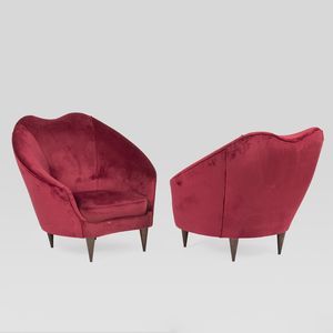 77x88x80 cm. Italia, anni 50 coppia di poltrone in legno e tessuto imbottito