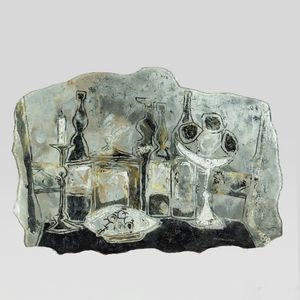 80x117 cm. Italia, anni 50 pannello in cristallo scalpellato retrodipinto, firma dell'artista incisa, firma del [..]