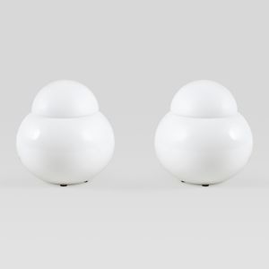24x23 cm. Italia, anni 60-70 coppia di lampade da tavolo mod. Daruma in vetro opalino soffiato lucido, etichetta [..]