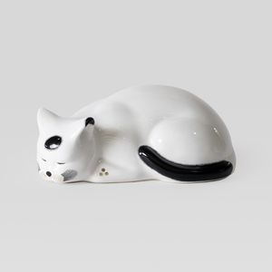 14x33x19 cm. Italia, anni 60 gatto dormiente scultura in ceramica bianca e nera, etichetta della produzione