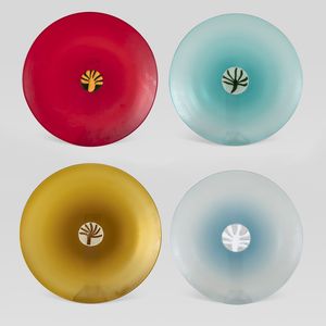 d. 34,5-36,5 cm. Murano, anni 70-80 serie di piatti le Quattro stagioni in vetro ad incalmo battuto e murrina [..]