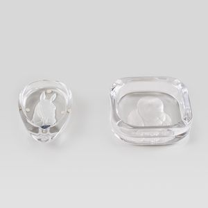 5x16x16 cm. - 3x18x11 cm. Francia, anni 80 due posacenere in cristallo con animali, marchio della produzione