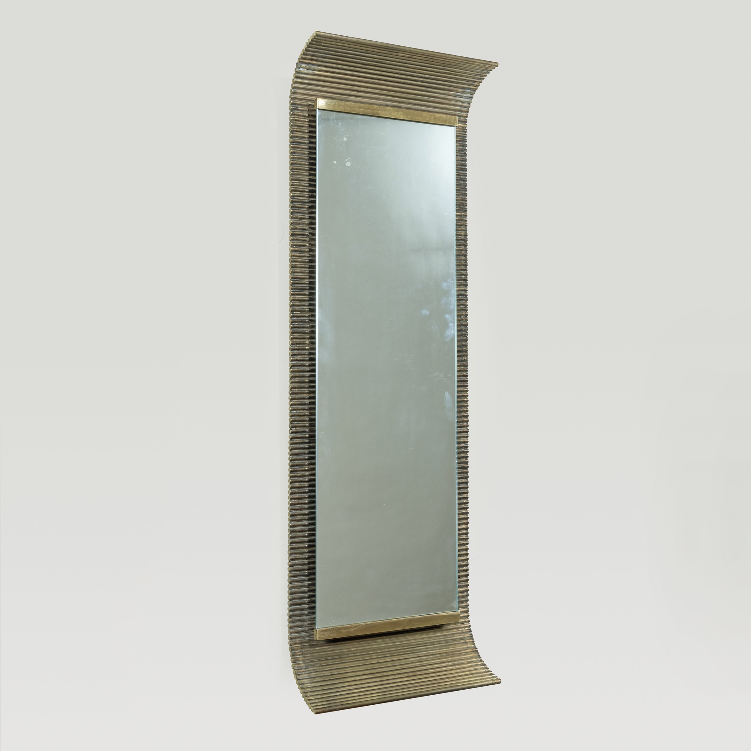 118x38 cm. Italia, anni 50 specchio da muro con cornice in ottone spazzolato a righe e vetro specchiato, etichetta della produzione. Bibliografia; Quaderni Vitrum n. 8 specchiere e specchi di E. Paoli, a cura del Cisav pag. 124; L'importanza dello specchio di E. Paoli.