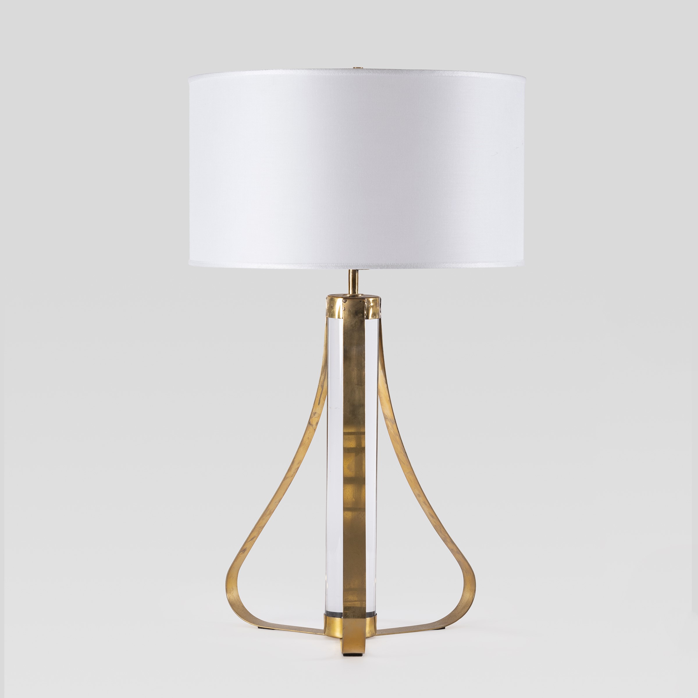 Italia, anni 70 lampada da tavolo in ottone e perspex, completa di paralume in tessuto
