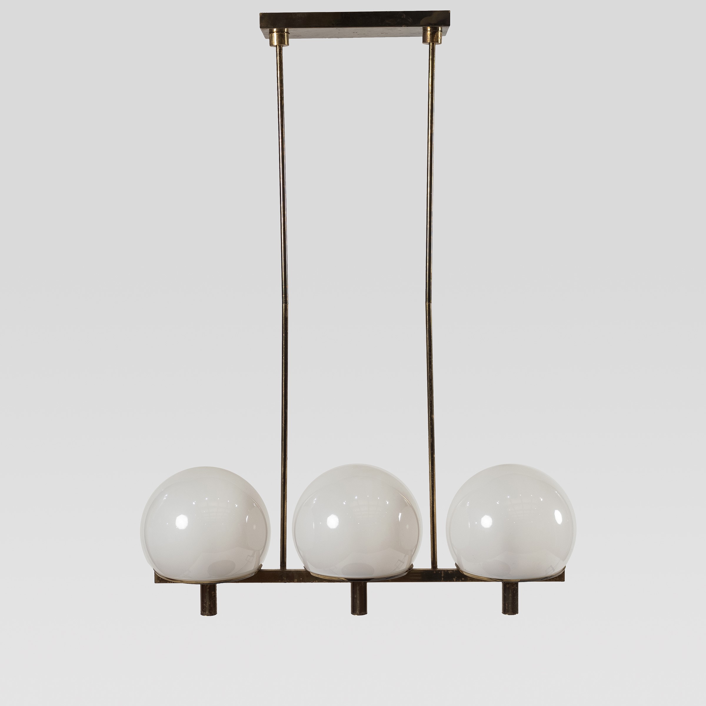 anni 70 lampada a sospensione in ottone e vetro lattimo, etichetta della produzione