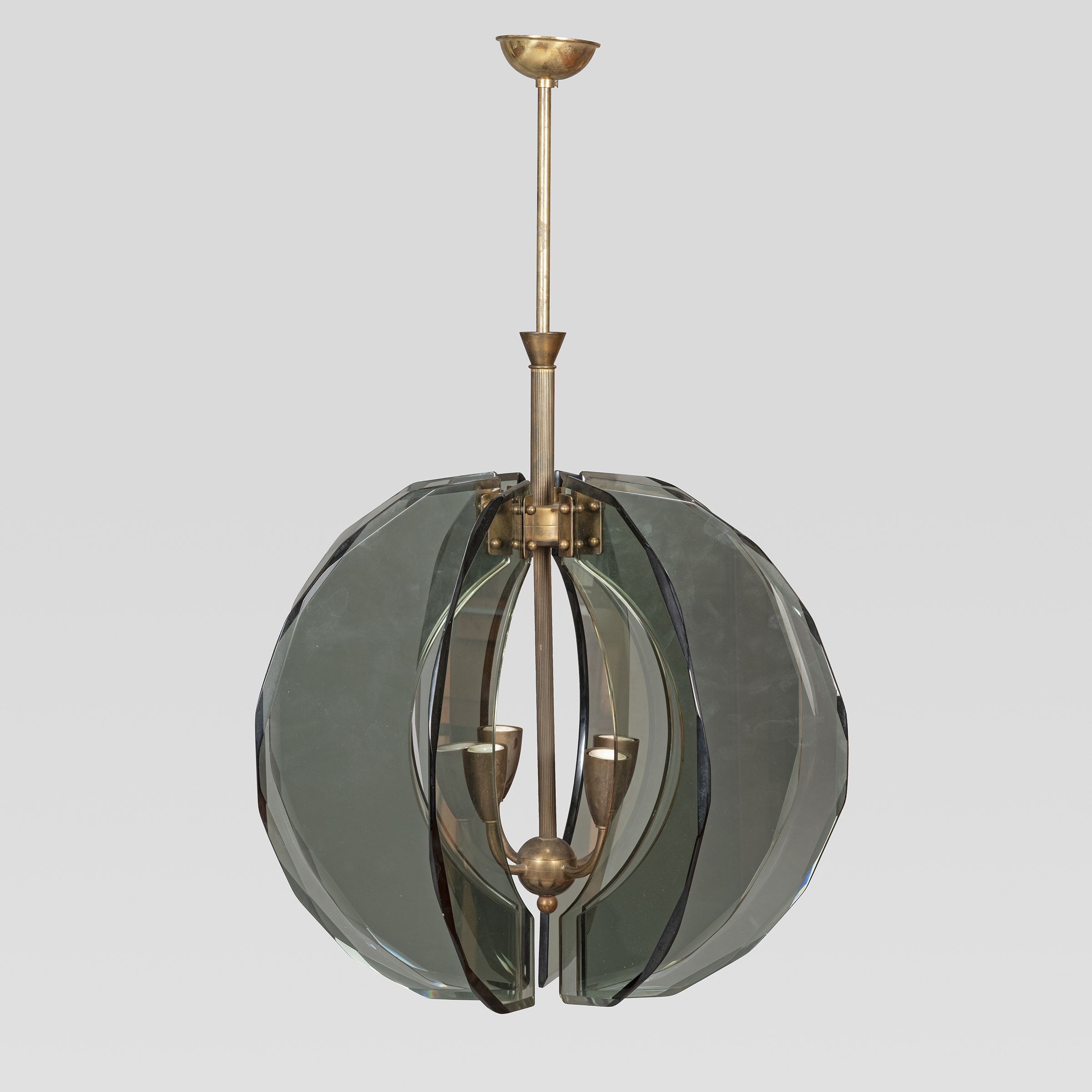 Italia, anni 60 lampada da soffitto in vetro fumè e ottone