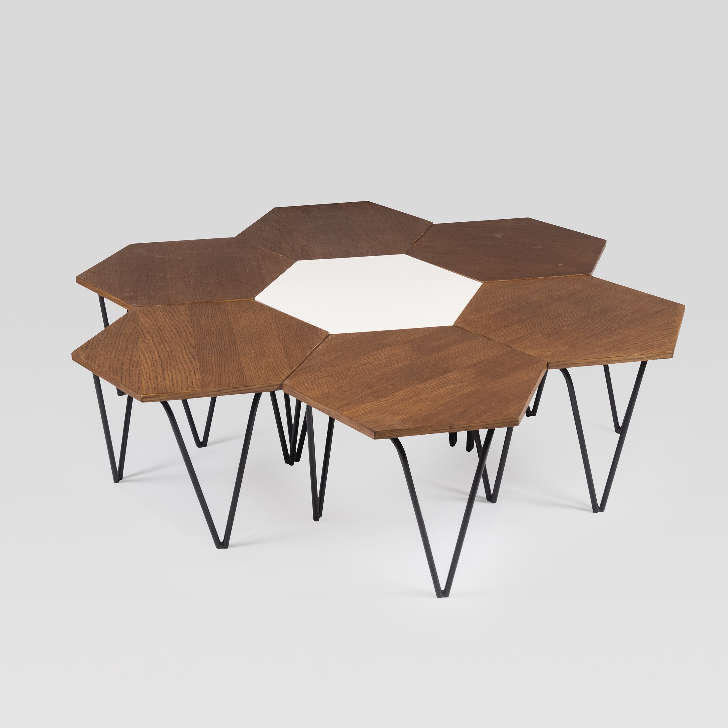 Italia, anni 50 sette tavolini in legno e metallo verniciato, etichetta della produzione