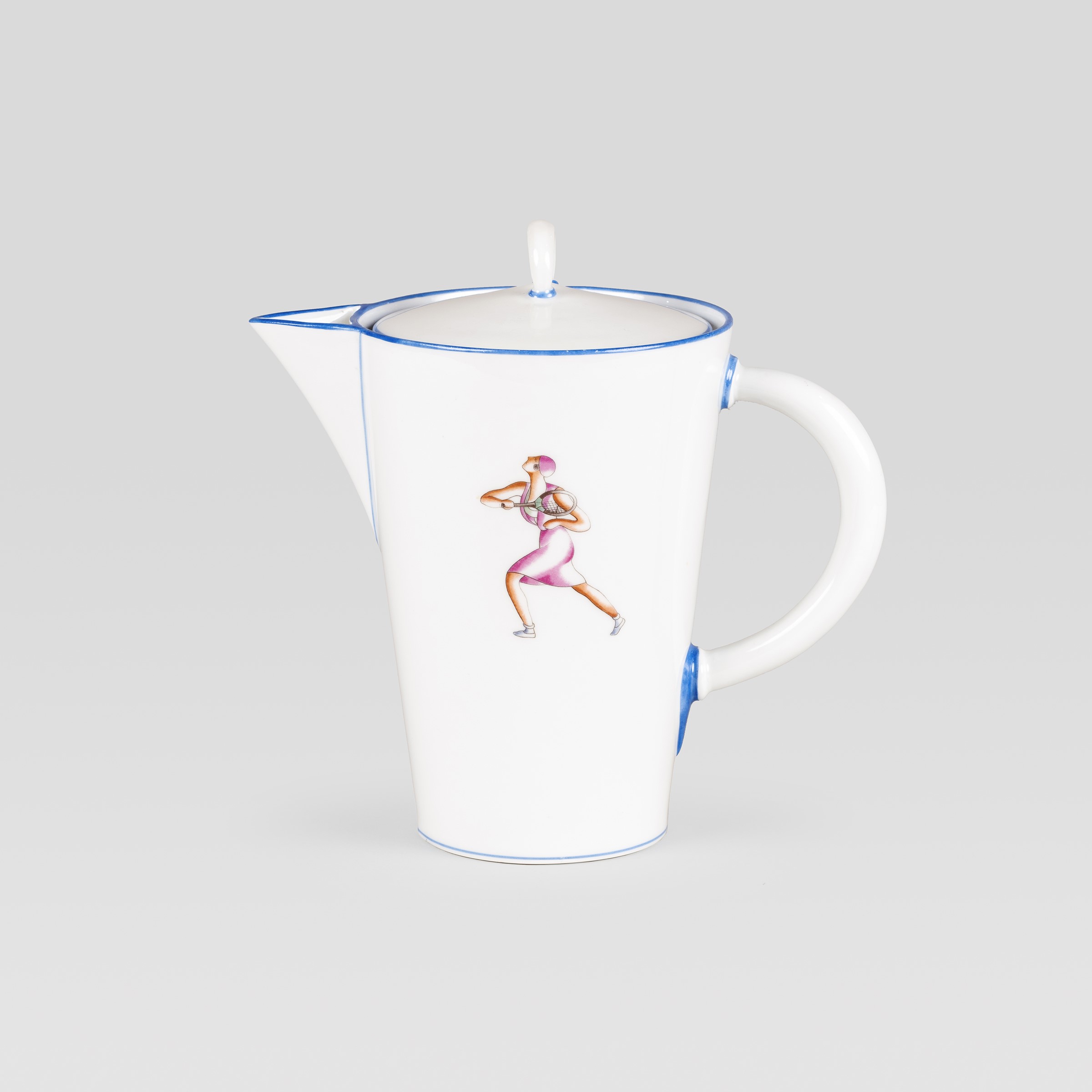 Italia, anni 30 caffettiera serie Gli Sport - Tennis, porcellana smaltata in policromia, marchio della produzione in verde con i numeri 33.2 e marchio Richard Ginori Pittoria di Doccia