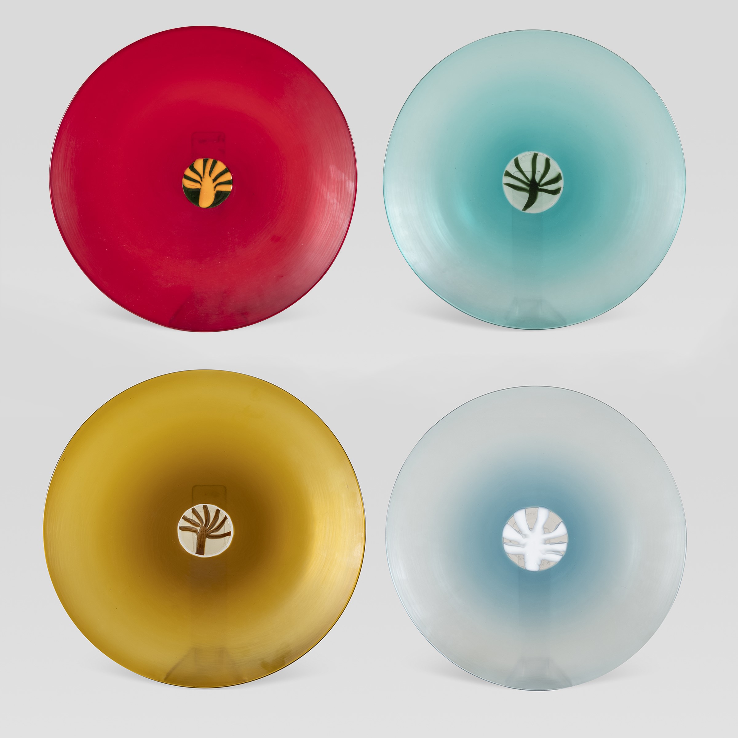 Murano, anni 70-80 serie di piatti le Quattro stagioni in vetro ad incalmo battuto e murrina centrale, firme incise: Autunno: Venini Laura Italia 100/24. Inverno: Venini Italia Laura 100/98 Primavera: Venini Italia Laura 100/98. Estate: Venini Italia Laura 100/41.