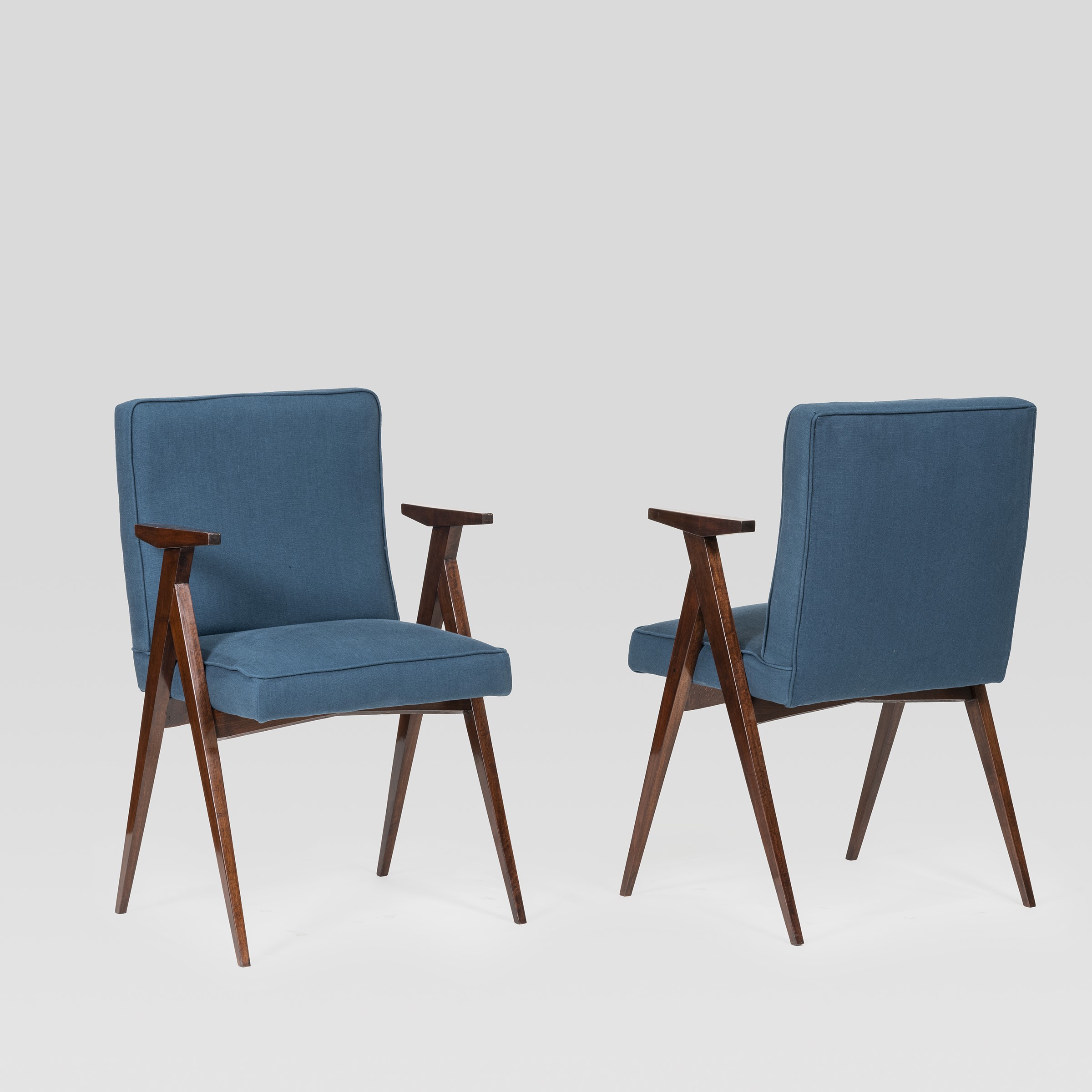 Italia, 1958 coppia di poltroncine in legno e tessuto imbottito