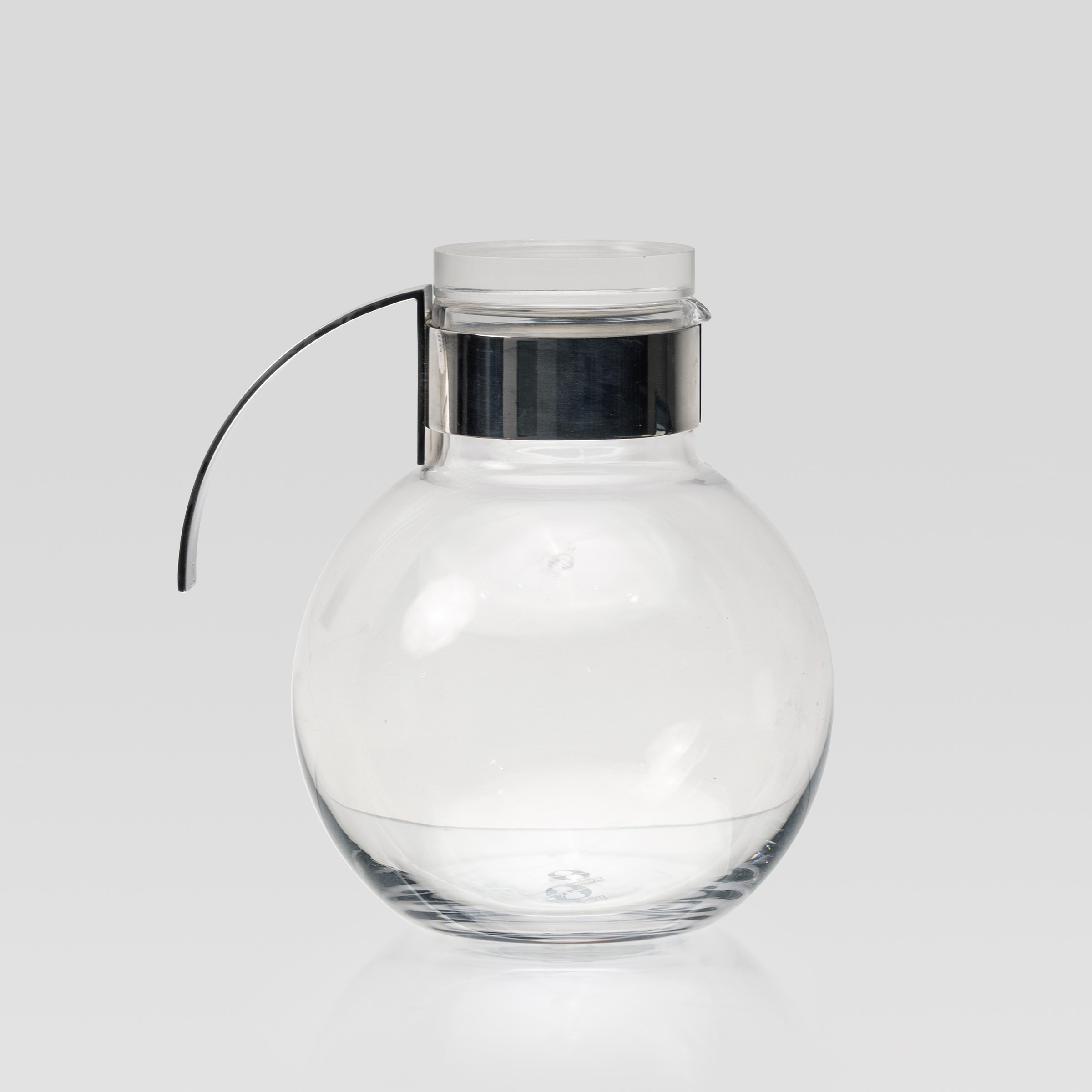 anni 70 caraffa in vetro, plexiglass e metallo argentato, marchio ed etichetta della produzione