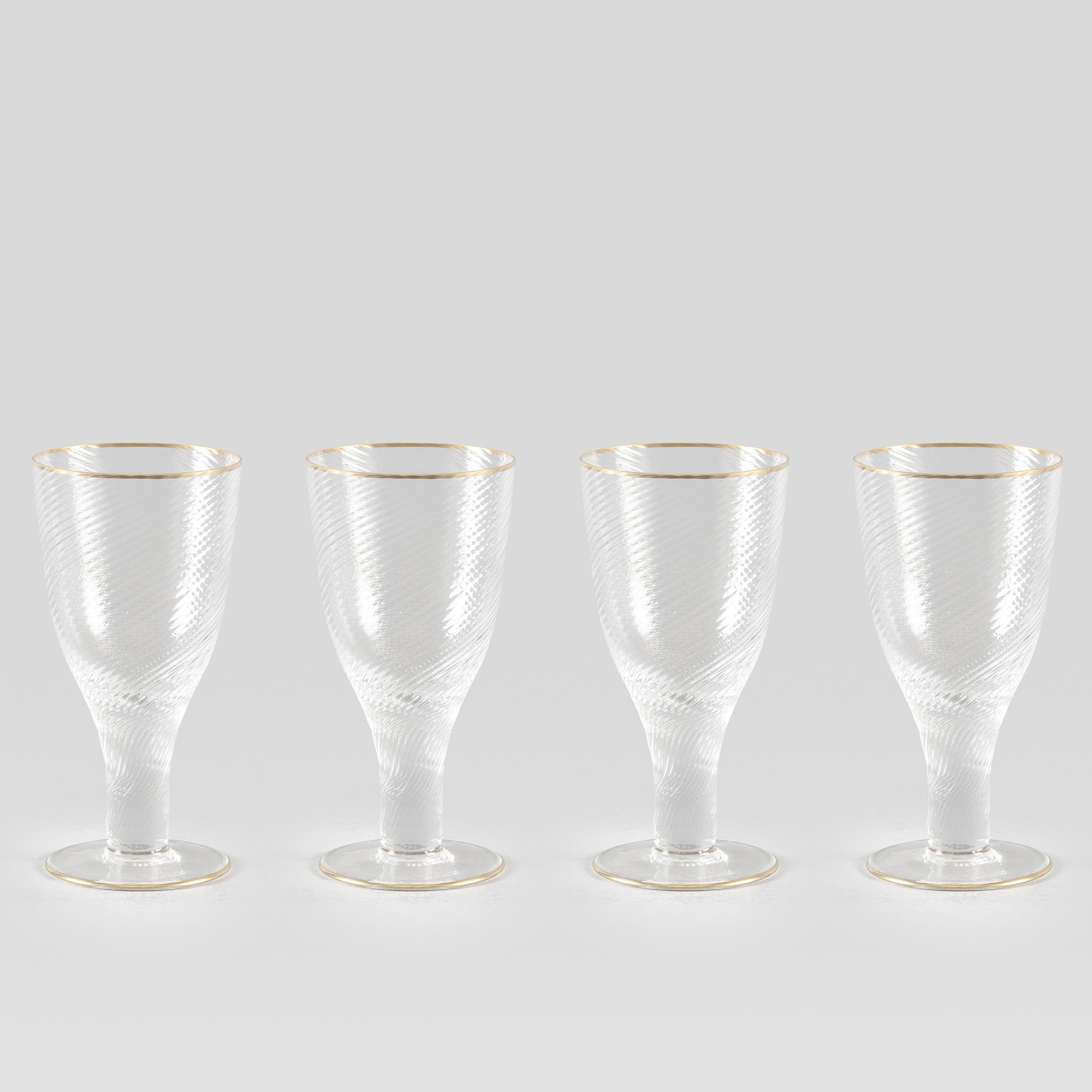 Italia, anni 70 quattro vasi a calice in vetro trasparente a spirale e profilato in oro