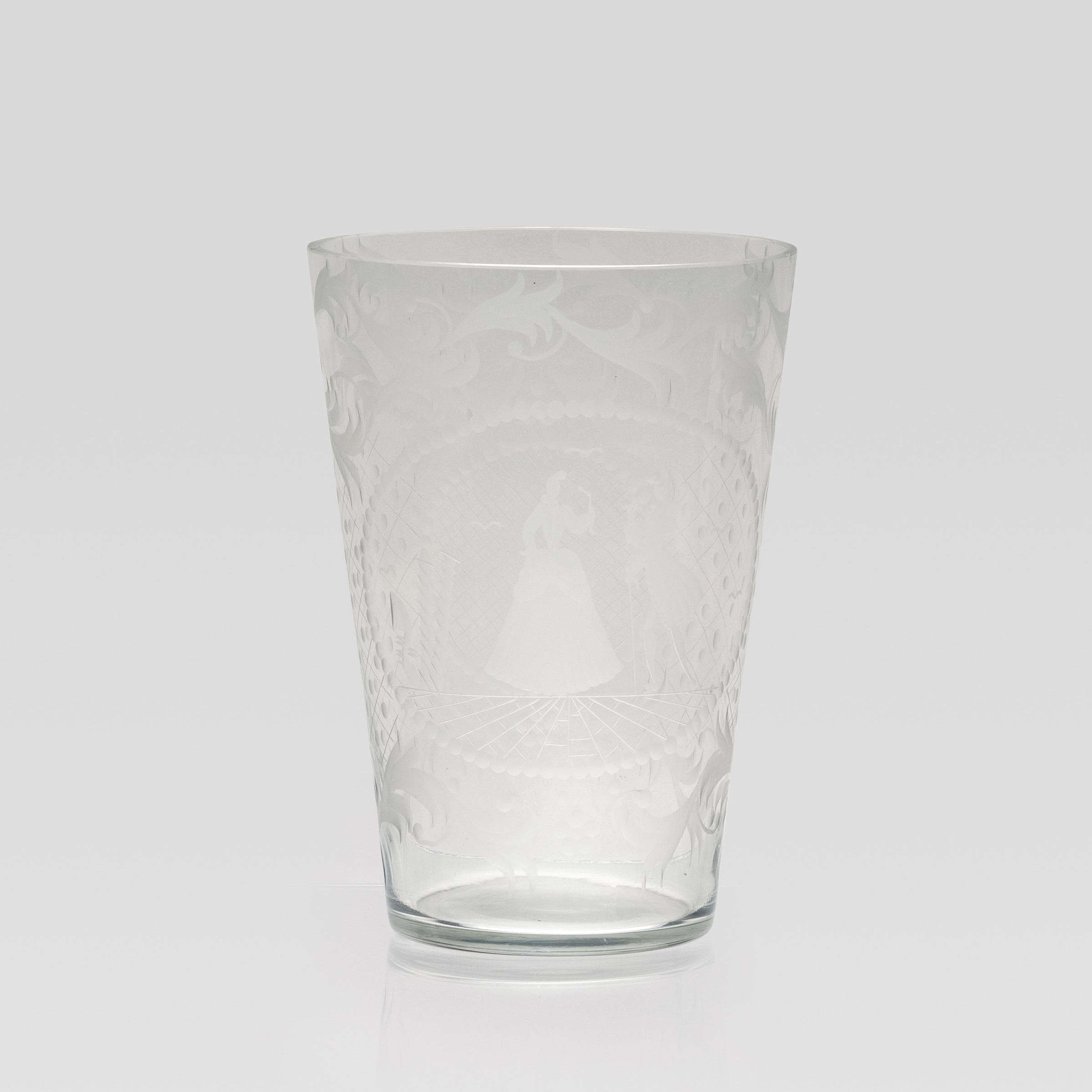anni 70 vaso in vetro trasparente inciso con motivi di figure veneziane