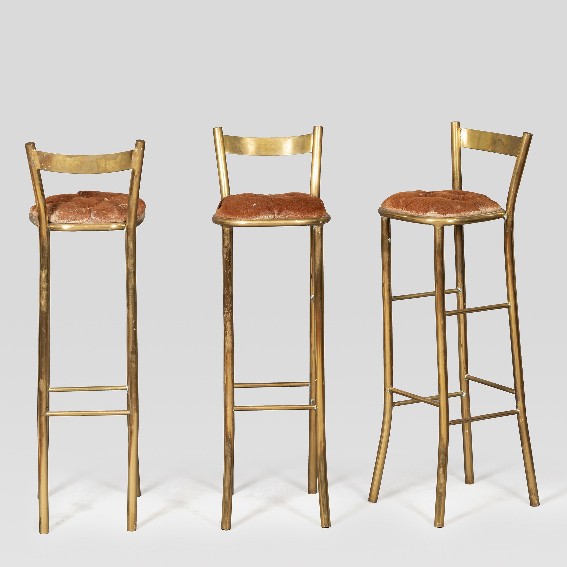 anni 50 tre sgabelli in ottone e tessuto imbottito, difetti