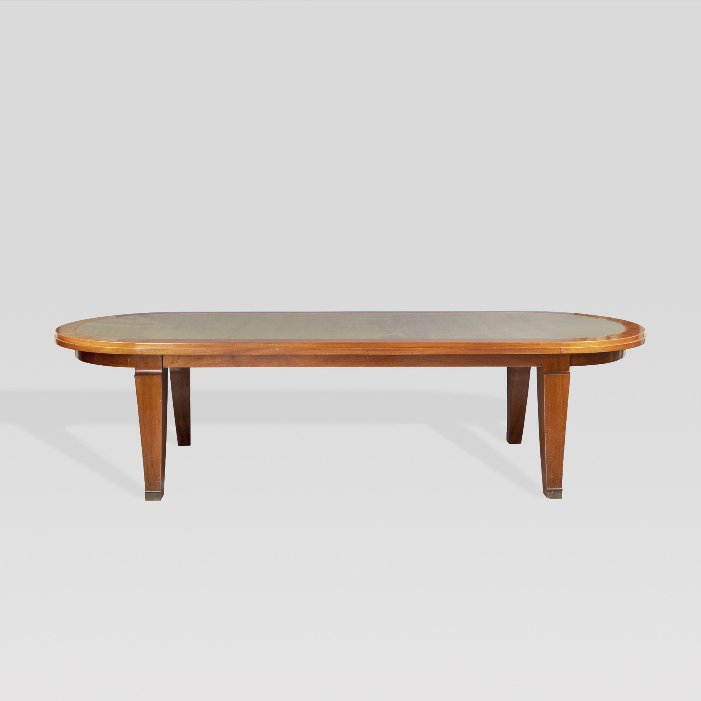 XX Sec. tavolo con otto sedie in mogano, cristallo e tessuto imbottito