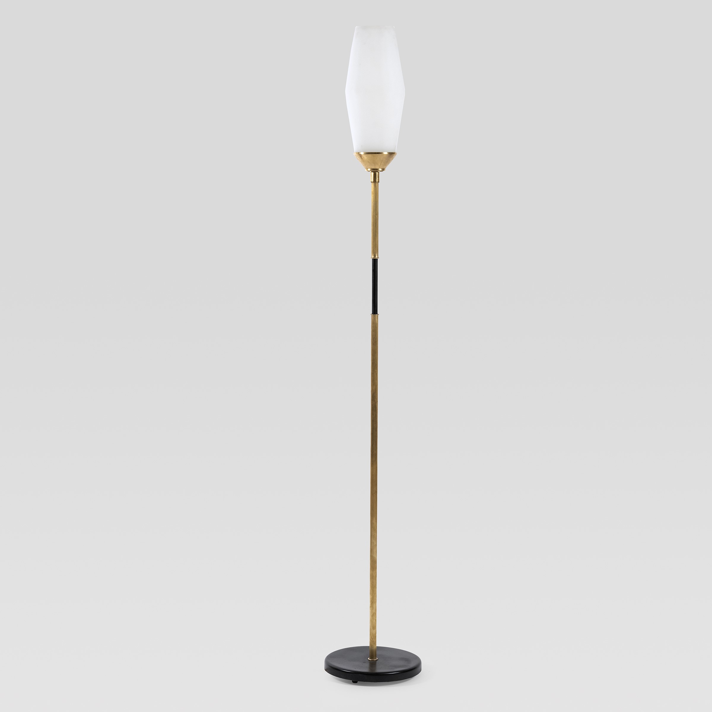 anni 50 lampada da terra in ottone, metallo verniciato e vetro opalino
