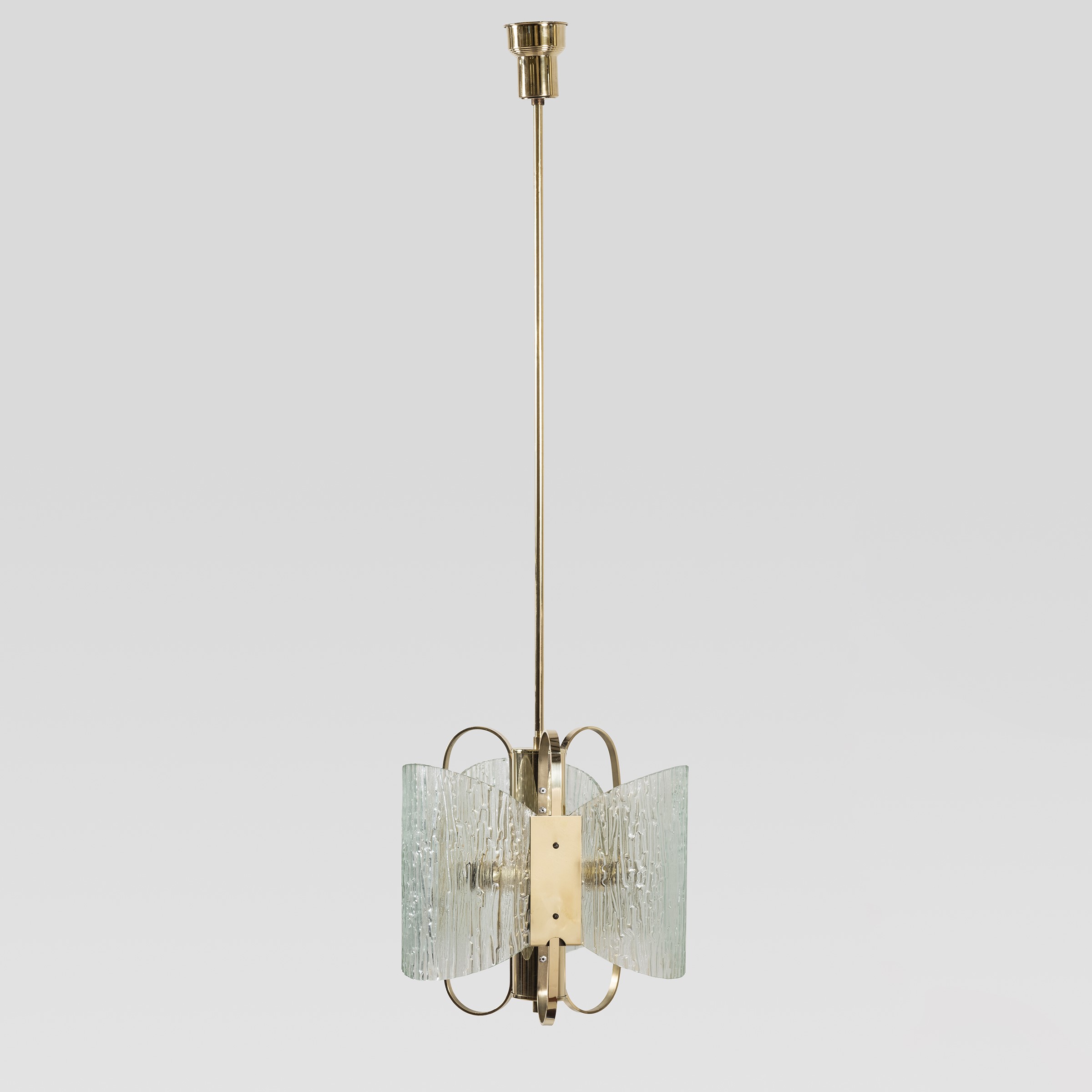 anni 70 lampada a sospensione in vetro stampato curvato ed ottone