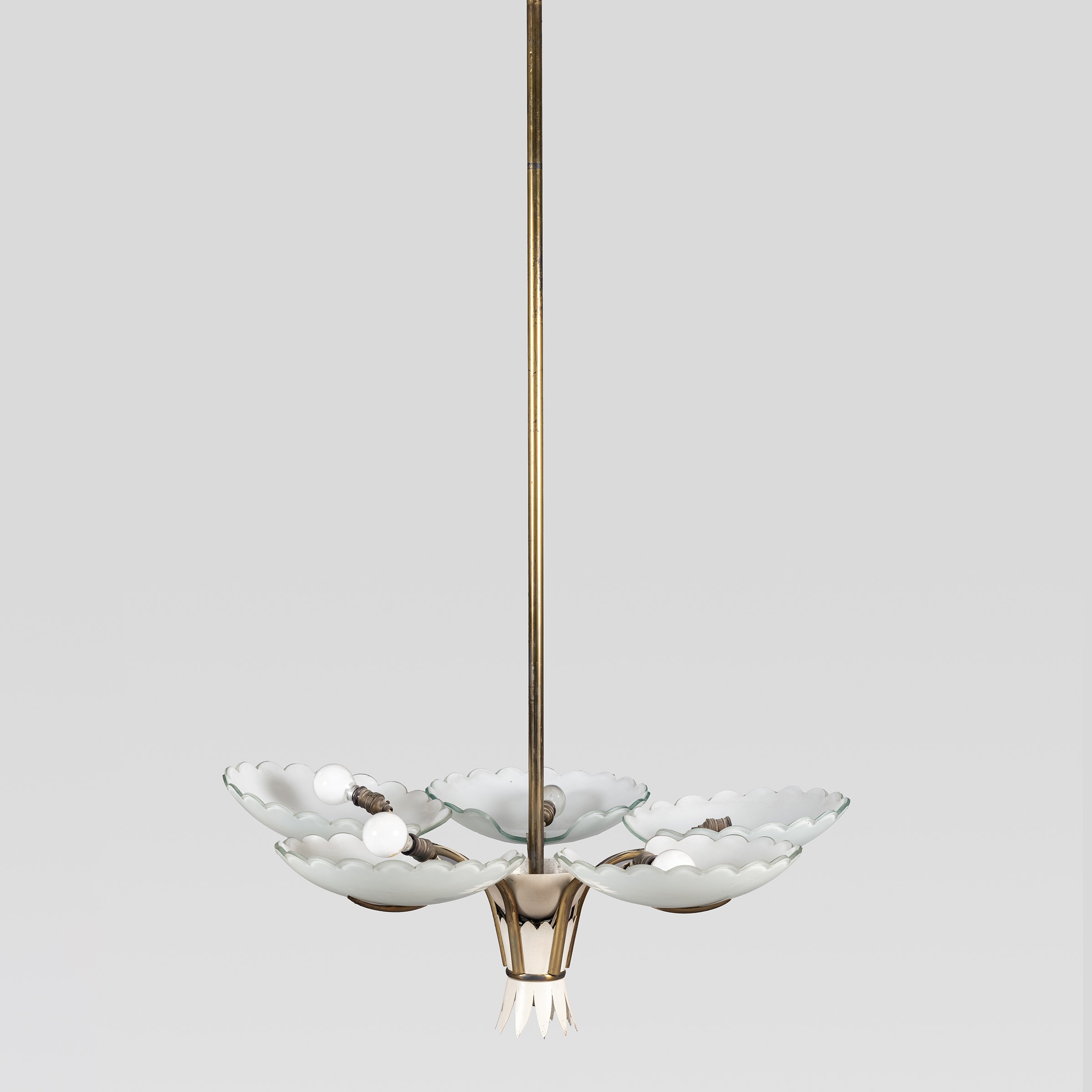 anni 50 lampada a sospensione in ottone, metallo verniciato e vetro lattimo