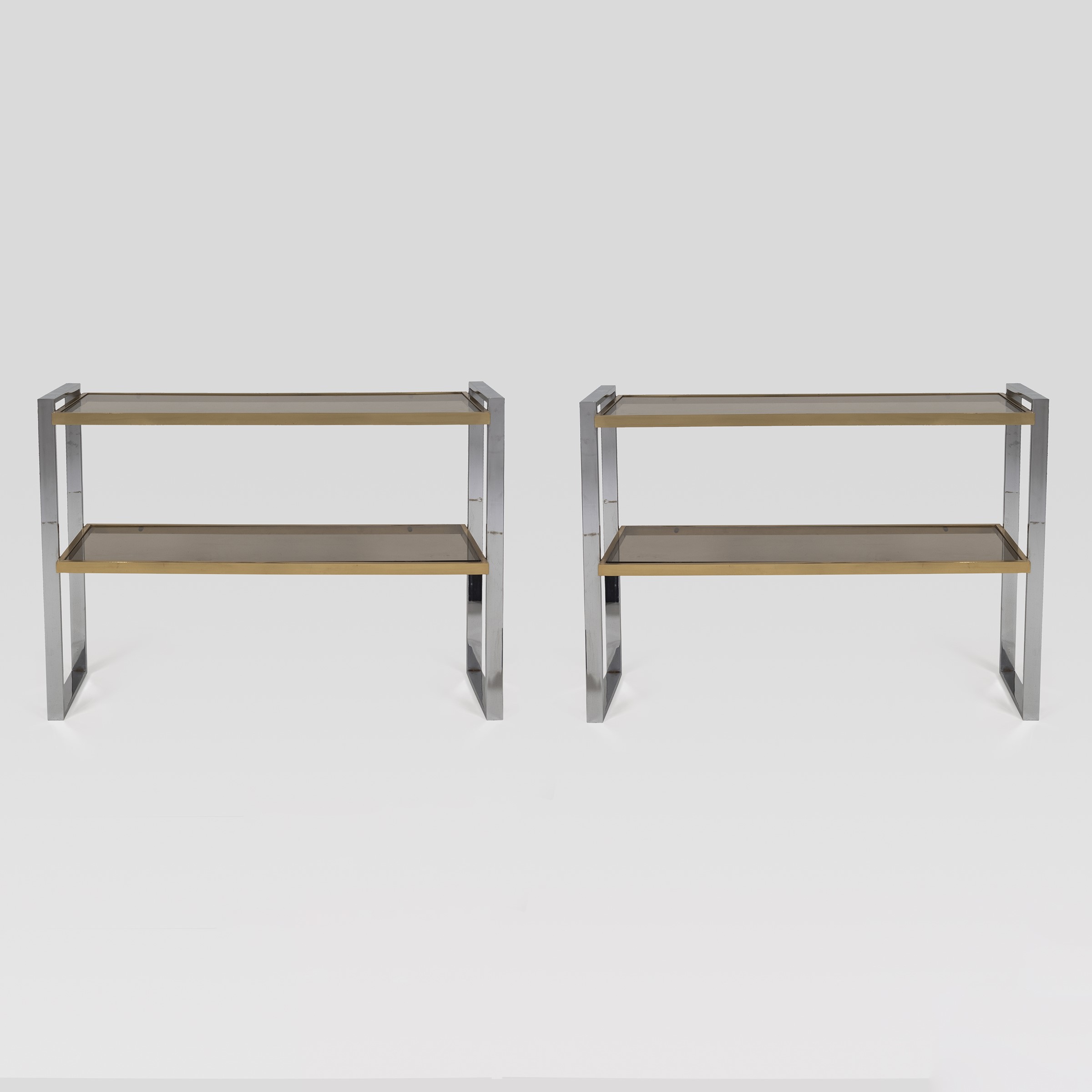 anni 70 coppia di consolle in acciaio, ottone e vetro trasparente