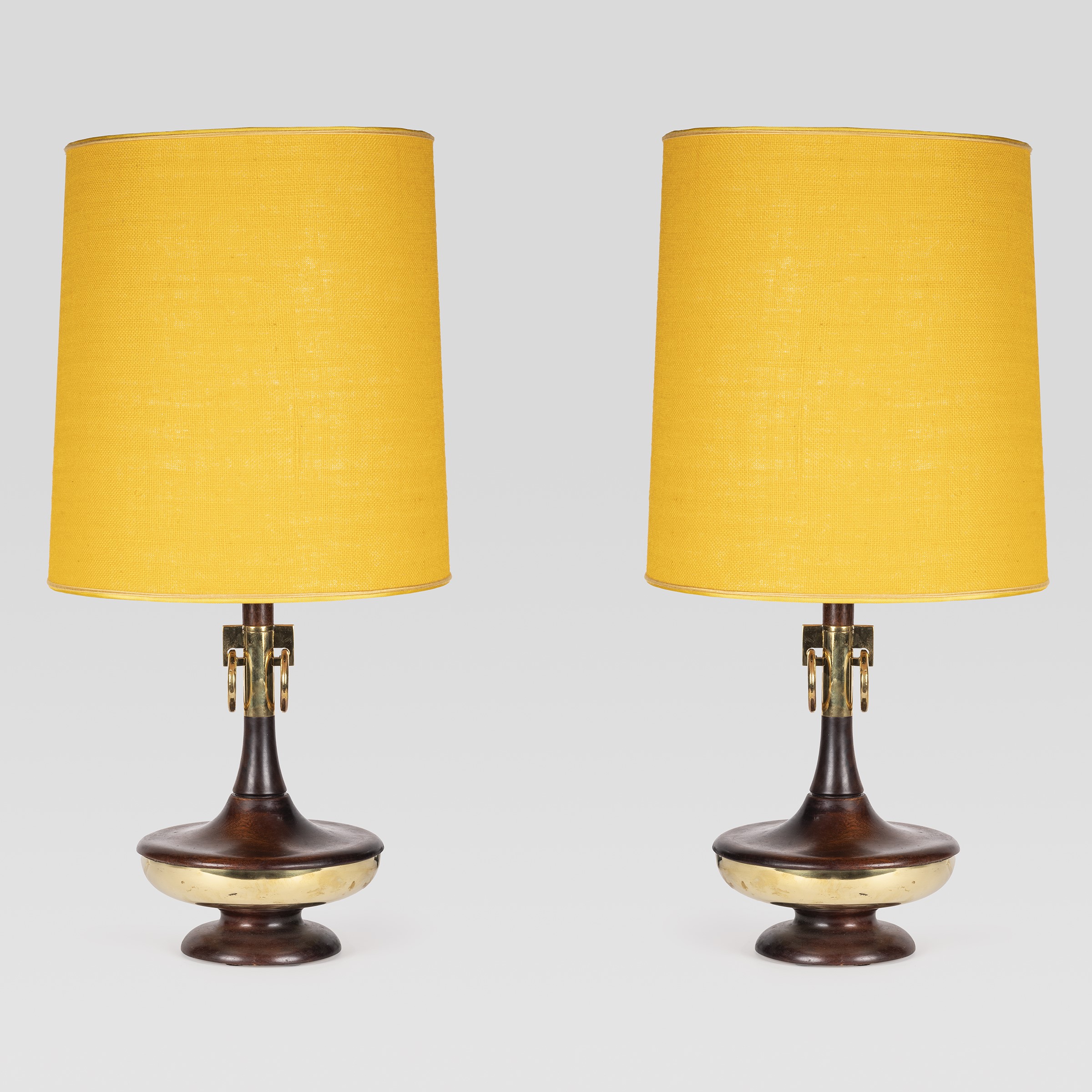 anni 50 coppia di lampade da tavolo in legno ed ottone, complete di paralumi in juta