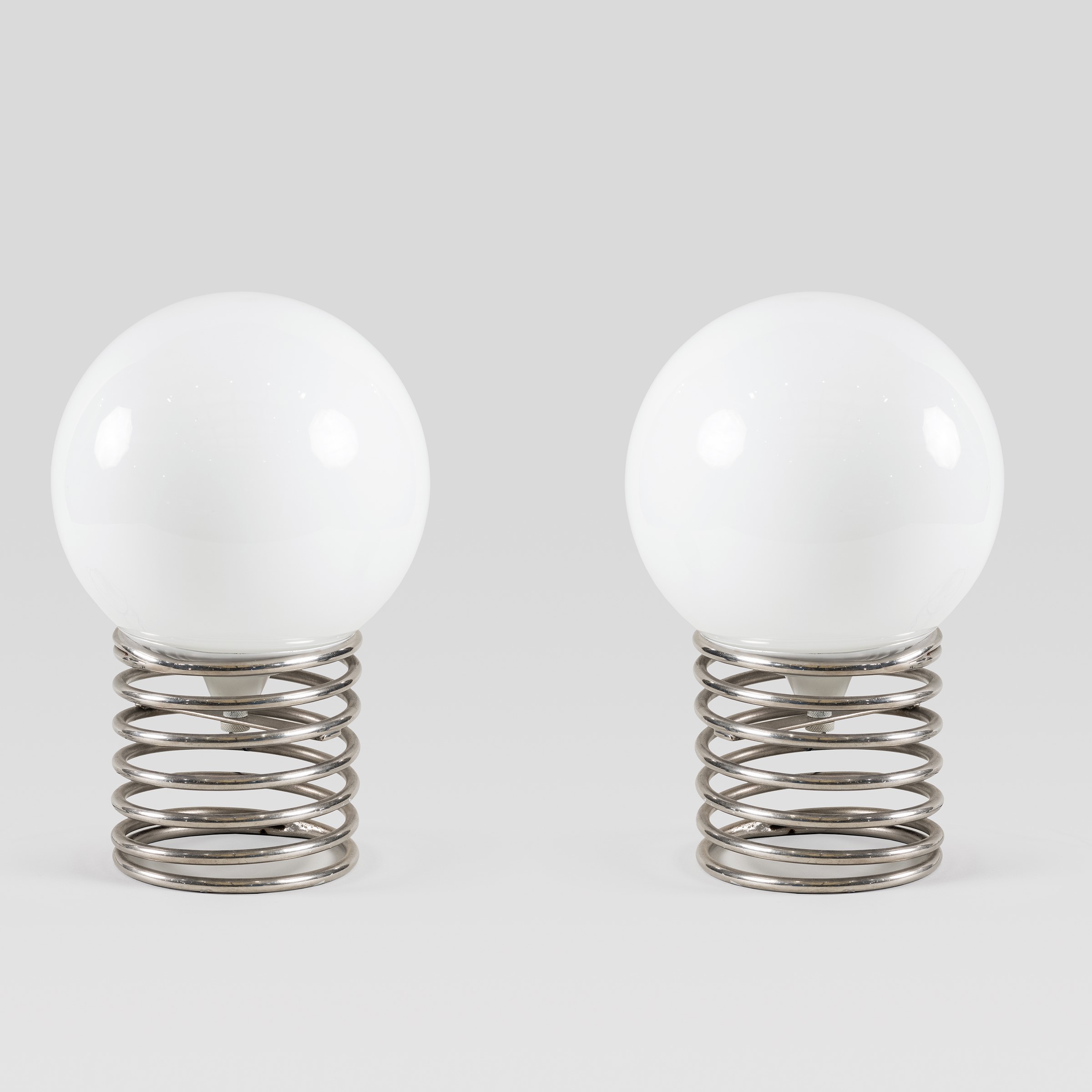 anni 70 coppia di lampade da tavolo a molla in acciaio e vetro lattimo