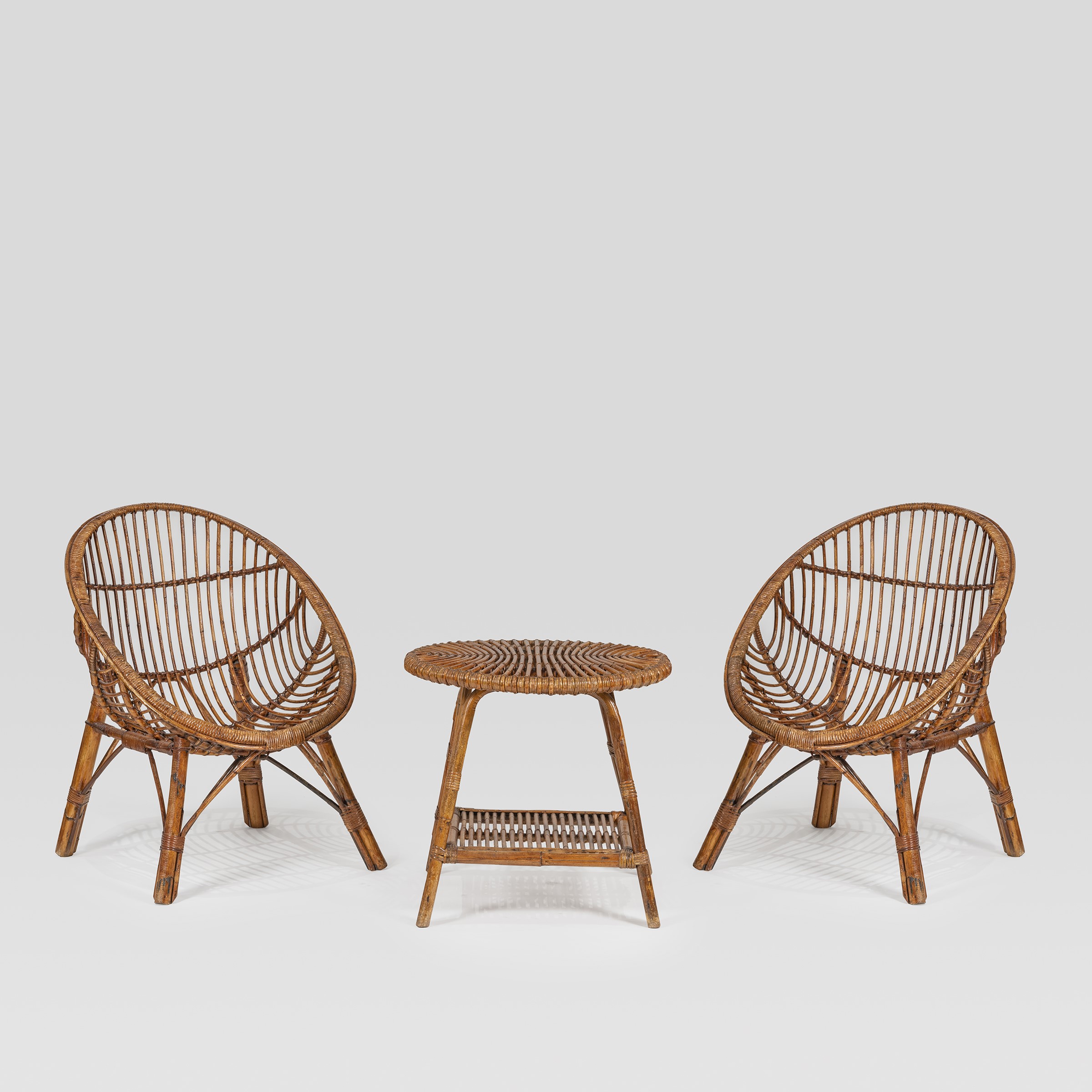 anni 60 set da giardino in rattan e bambù, composto da una coppia di poltrone e un tavolino