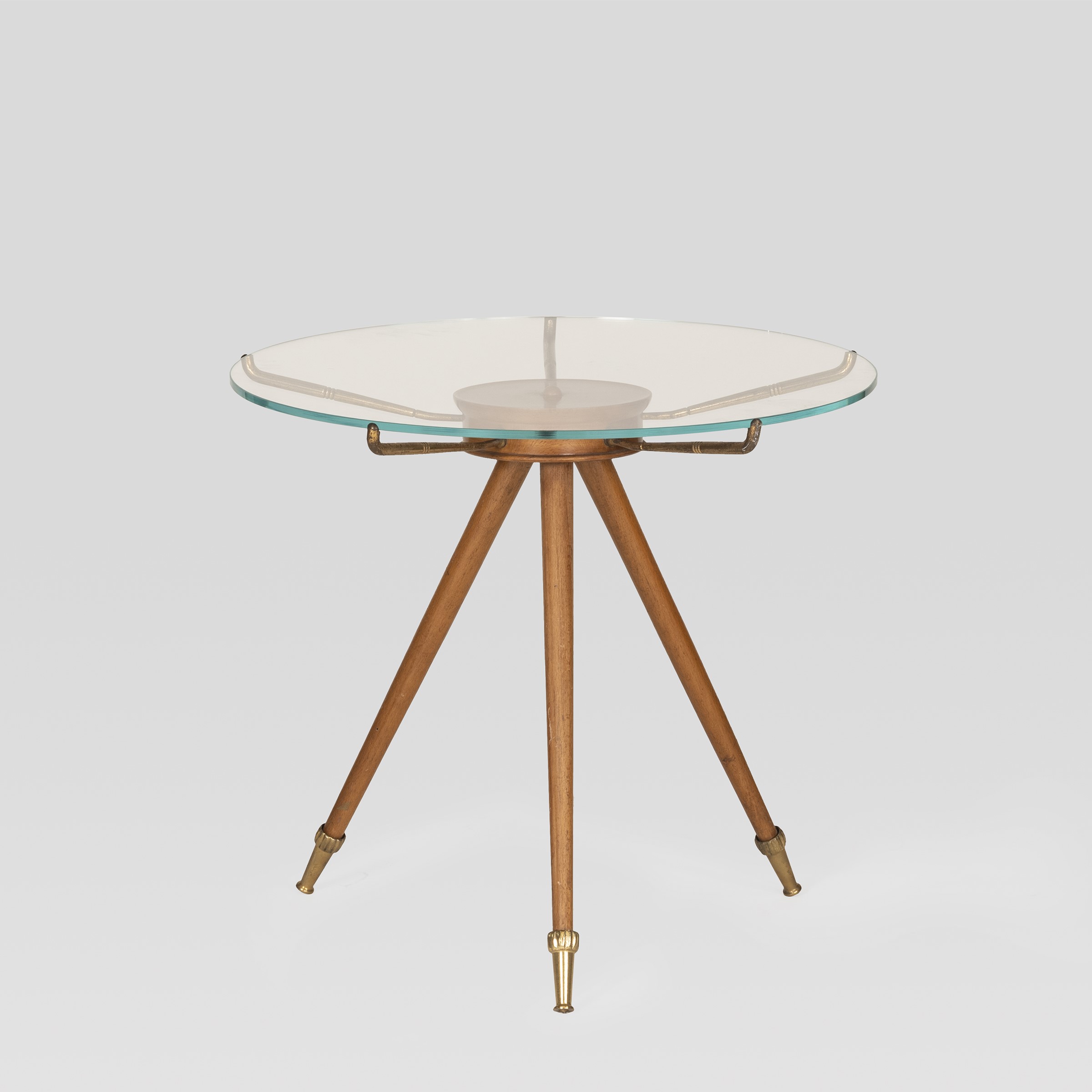 anni 50 tavolino basso in legno, ottone e vetro trasparente
